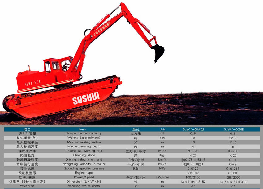 SLWY60型水陸兩用全液壓?jiǎn)味仿膸酵诰驒C(jī)系我公司制造的清淤機(jī)系列產(chǎn)品,經(jīng)過(guò)部級(jí)鑒定,該機(jī)性能先進(jìn)、機(jī)動(dòng)靈活、工作效率高,并能自行出入水域、上下河坡,可在陸地、水中、淤泥地、輕沼澤地和雜草地帶施工作業(yè)。